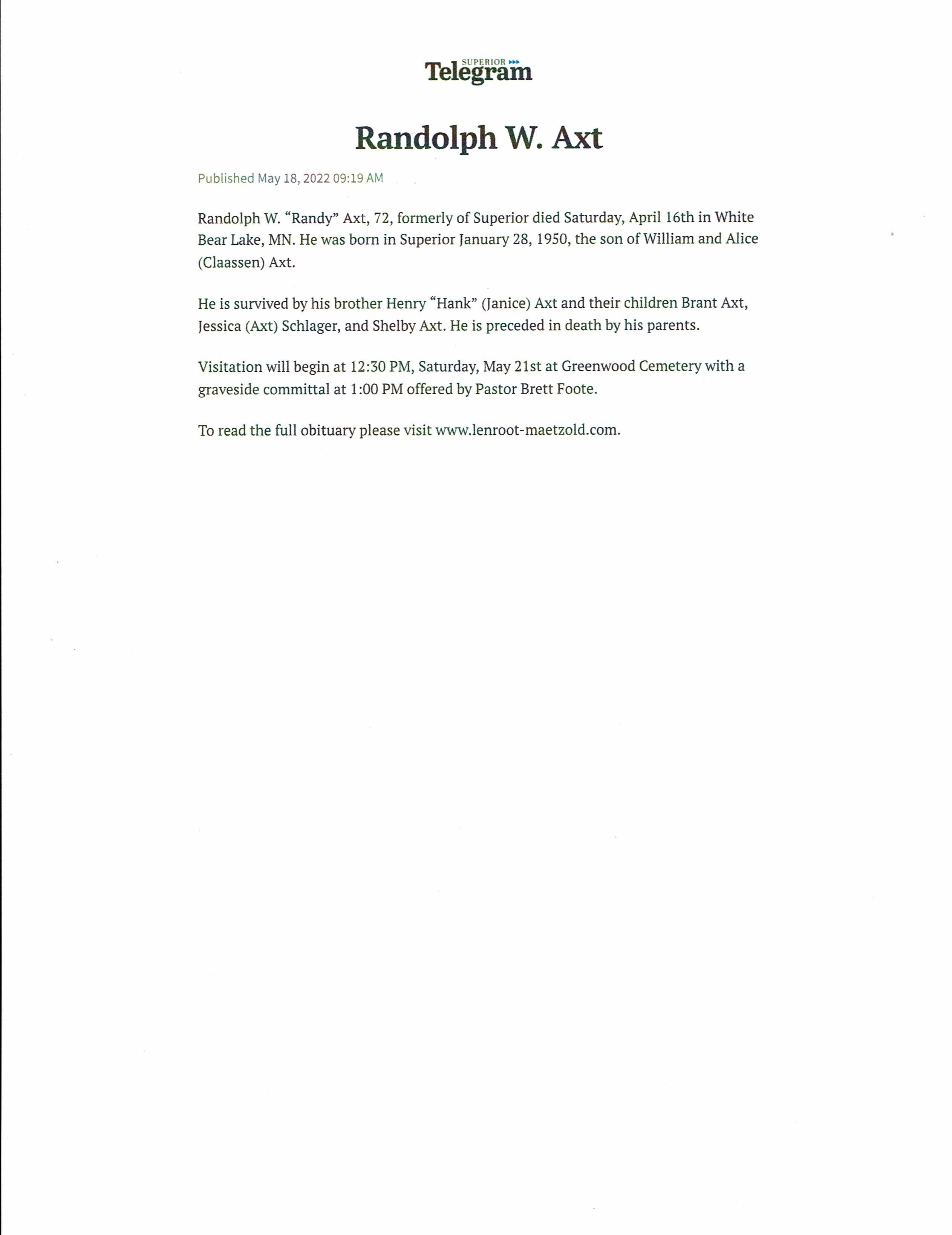 Randolph (Randy) W Axt