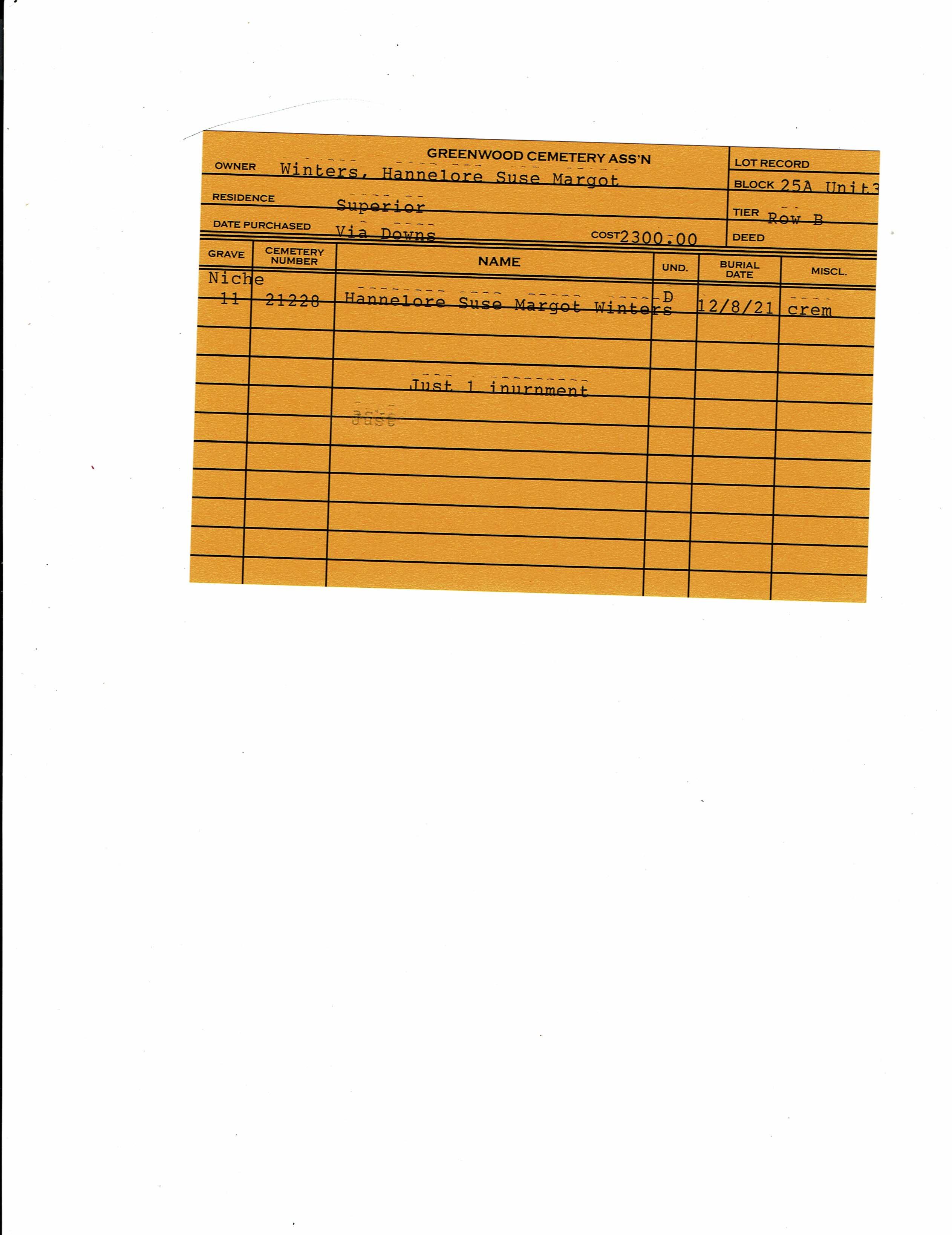 Block 25A, Tier Row B, Lot Unit 3, Grave Niche 11