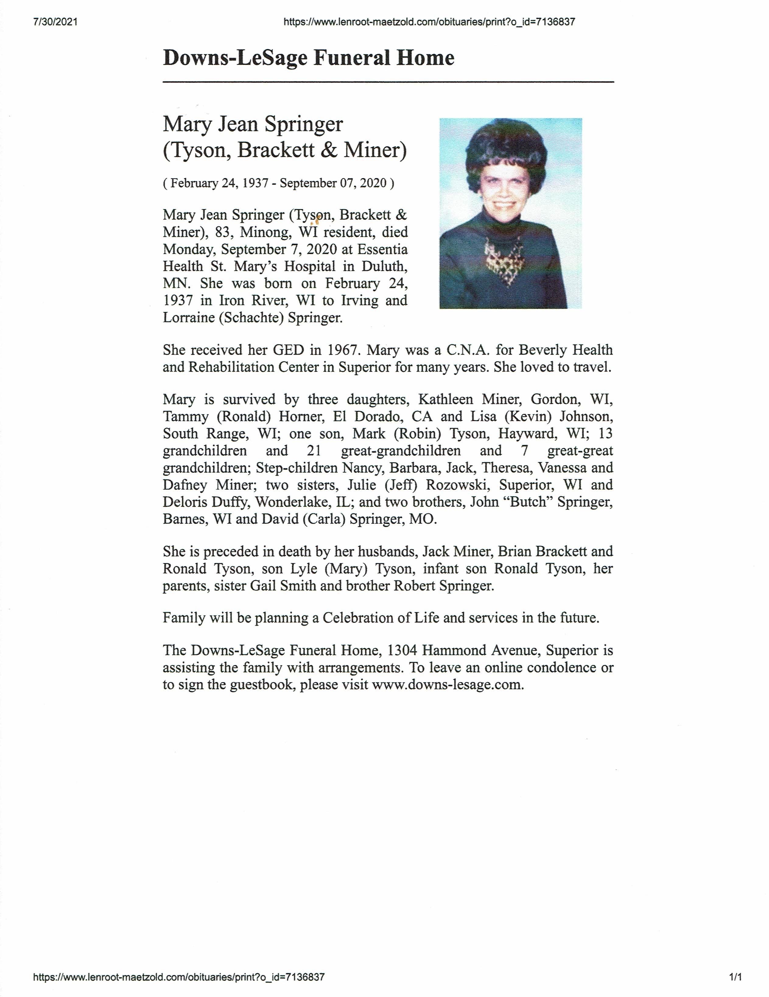 Mary Jean Springer (Tyson,Brackett,Miner)
