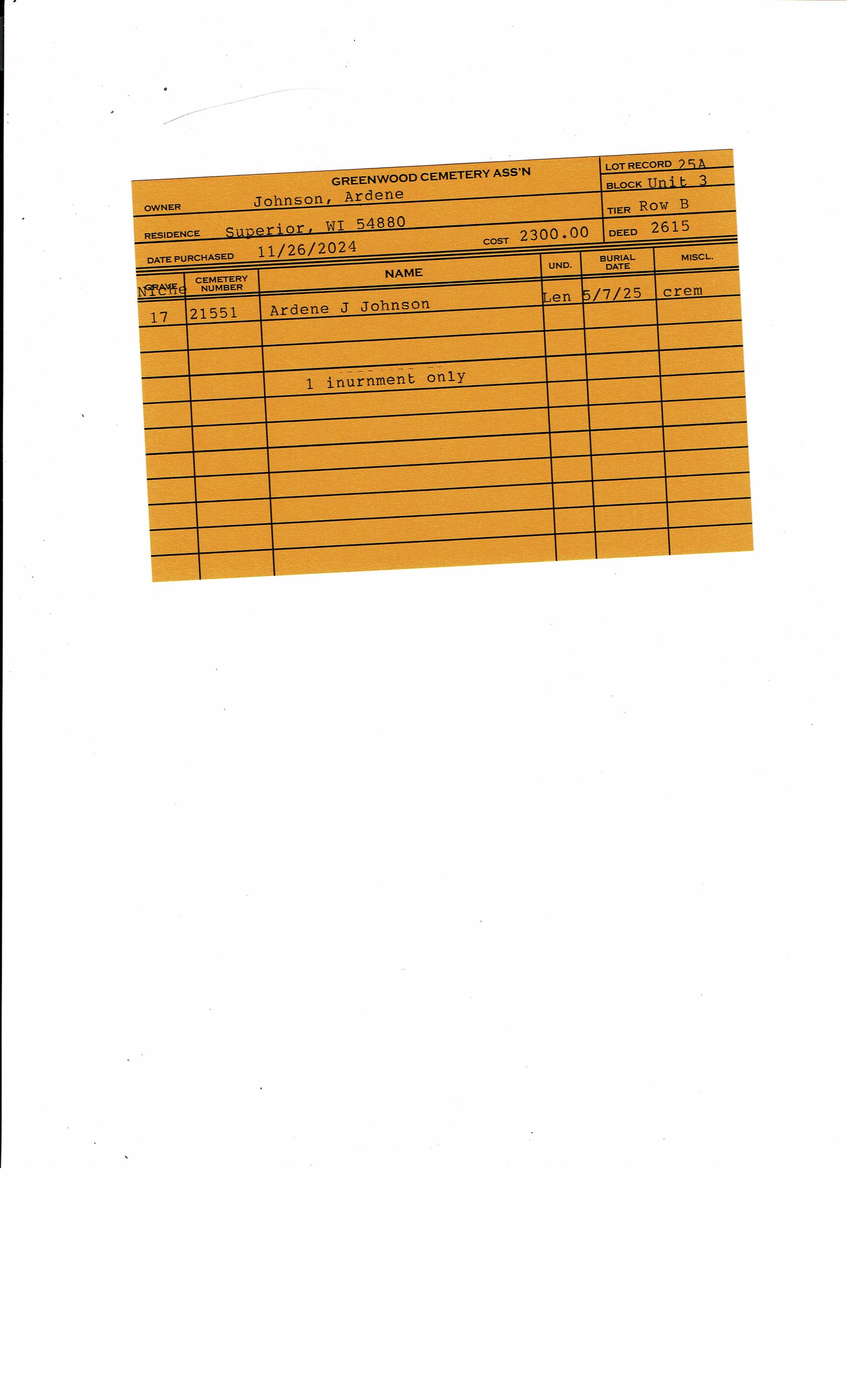 Block 25A, Tier Row B, Lot Unit 3, Grave Niche 17